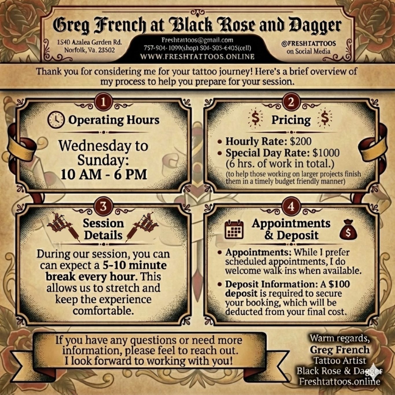 Take a second to read over the information in the image. There you will find my schedule, hourly rates and info on what to expect when getting tattooed by me. I look forward to working with you!
